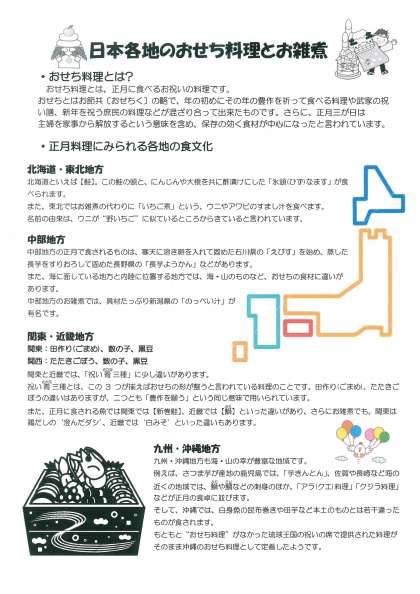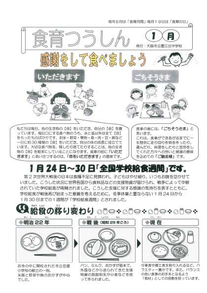 「食育つうしん」1月号が発行されています。今週は、全国学校給食週間(24日〜30日)です。給食の移り変わりなども記事として掲載されています。