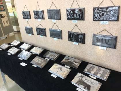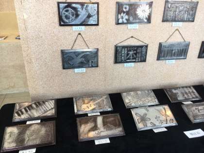 本校の作品も展示されています。造形の部門では1年生のメタリックサインボード22点が出展され、近畿部門では、3年生の点描画2点が選ばれています。どれも力作ばかりです。