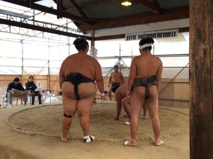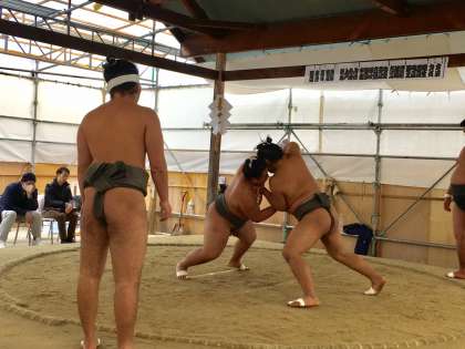テレビと違い、ほんとうにそばでお相撲さんがぶつかり合う姿が見られます。その度に頭が当たる音や体のぶつかり合う音など迫力満点です。住吉大社前には、相撲ののぼりも上がり風情にあふれています。住吉は本当に文化と歴史の町だと感じさせてくれます。月曜日の全校集会には、このお相撲さん達が本校にあいさつに来ていただける予定です。
