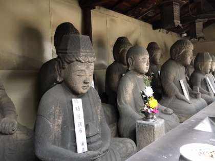 本校東側は、「熊野街道」です。現在は地域の皆さんの生活道路になっていますが、街道沿いには、歴史を感じさせてくれる、お寺や民家が現在も見られます。ちょうど南海住吉東駅にさしかかるところに今回の「宝泉寺」があります。この寺には、街道に面して13体の石仏がならんでいます。大きな石仏で、大阪市の文化財にも指定されています。こんな街中に石仏があるところにも驚きとともに改めて歴史を感じます。