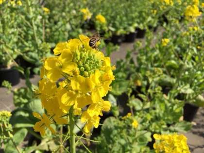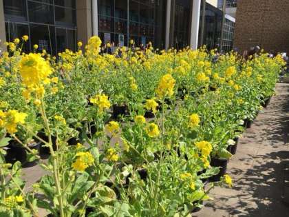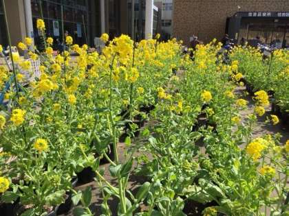 住吉区役所前の広場では、菜の花が見事に咲いています。好天の日曜日、艶やかな黄色の花が満開です。