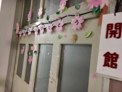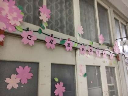 明日の卒業式に向けて、図書室も飾りつけされています。桜色のデコレーションは、春らしい卒業の華やかさを感じさせてくれます。