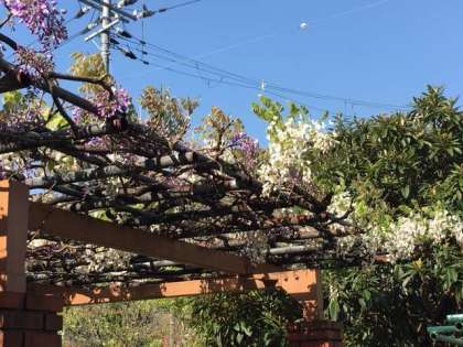 藤棚に近づきますと、とてもよい香りが漂ってきました。見上げますと、いつの間にかこの暖かさで藤がきれいに咲き始めています。近くにはさっそくクマバチがやって来ています。クマバチと藤の花の関係はあらためてお伝えします。学校へお越しの折にはぜひお立ち寄りください。