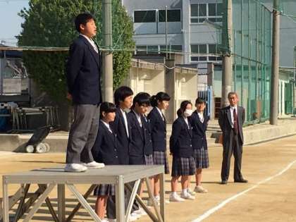 今日も、「おはようございます」の大きな声で全校集会が始まりました。練習の意味を兼ねて集会が続いていますが、早い時間に全員がんばってそろっています。