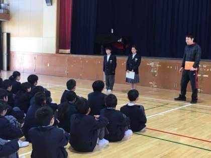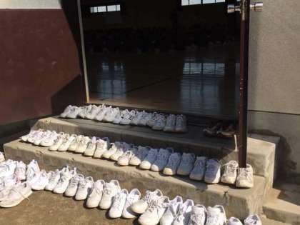 毎週金曜日は、今年も1年生の学年集会の日です。今日が最初の集会です。体育館入り口にきちんと並べられた靴は、1年生らしく、どれも真っ白です。また集会では、学年代表さんも紹介されました。