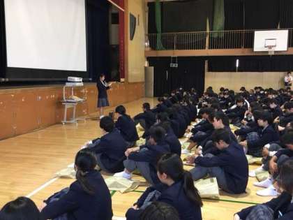 5月2回目の全校集会です。今日の表彰は、文芸部が競技かるたの大会で準優勝、陸上部では、記念大会で3000m、大阪市優勝の素晴らしい内容です。