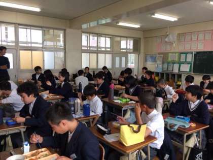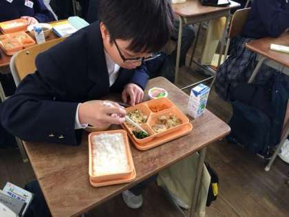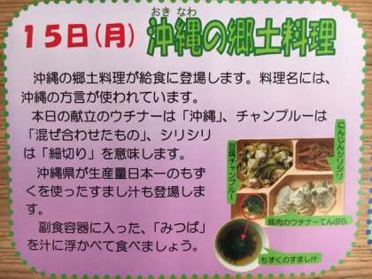 本校は現在、選択式の昼食になっていますが、給食を頼んでいる人は今日のメニューは、「沖縄の郷土料理」です。沖縄は私たちが住む大阪とは、食事も独特の郷土料理があります。琉球料理とも言われますが、今日はそのメニューで出されました。デザートには「シークワーサーのゼリー」も付いています。