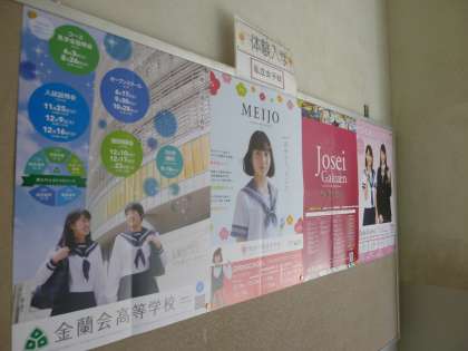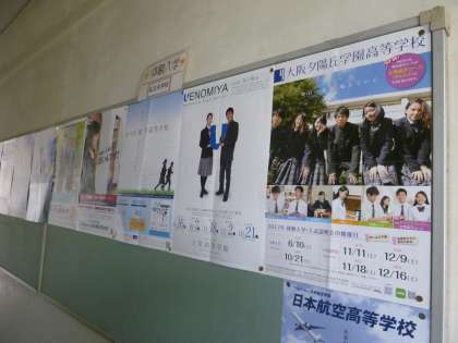 5月に入って、高校から先生方の訪問が相次いでいます。そしてその多くがこれから行われる、高校の体験入学やオープンスクールの案内です。廊下には早くも各高校のポスターが掲示されています。この体験は、3年生が主に対象ですが、2年生や1年生も可能ですので参考に見ておくとよいかもしれません。
