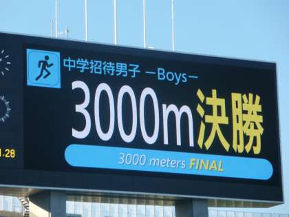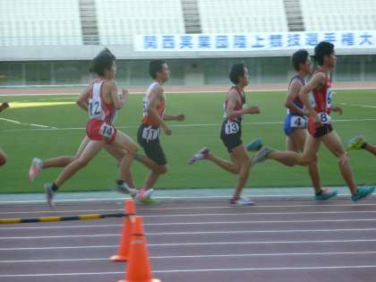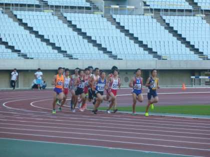 19日(金)17:40、関西実業団陸上競技選手権大会中学生招待レースのスタートが切られました。会場は長居の6万人収容のメインスタジアム、大阪府を代表する中学生長距離選手が競う最高レースです。前半からハイペースで、最初の1000m、3分2秒で始まりました。その後、同じハイペースで試合は展開します。本校小林選手はトップ集団に付けました。(小林選手は11番です)