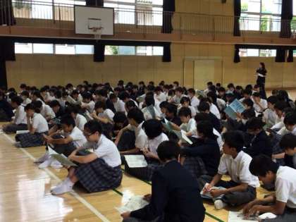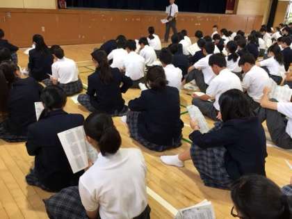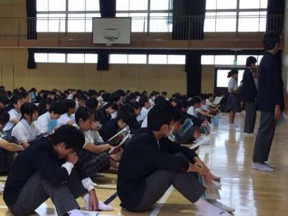 3年生はいよいよ修学旅行が迫っています。今日も集会では、念入りな確認作業が行われています。移動の際の隊形、バス乗車の順序、班別行動の手順など、仕上げの練習をしおりを遣いながら行いました。