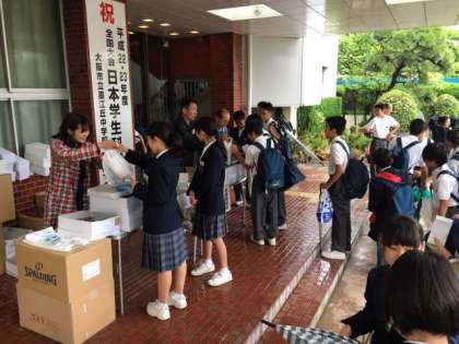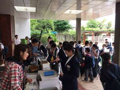 今日25日(木)、明日26日(金)、1年生では、水着の購入が行われています。玄関でナガオスポーツ店さんが来られて販売しています。水着は、水泳授業のほかに、まもなく行われます、和歌山での一泊移住でも使います。