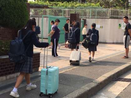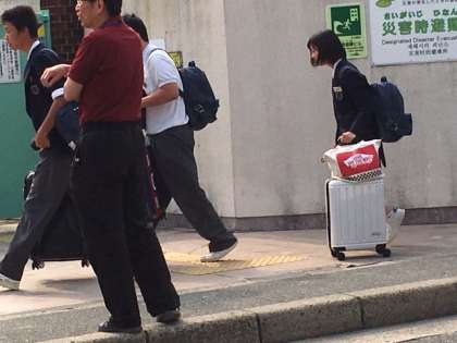あれ、3年生は旅行カバンを持っています。修学旅行は明日からですが.....