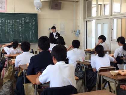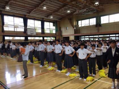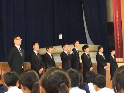 今日、月曜日は、定例の全校集会の日です。また今日から、教育実習生が新たに8人が加わり、紹介を行いました。全員が本校の卒業生ということで心強いです。お昼休みにはクラスでも紹介があり、早速、給食をいっしょにいただきました。