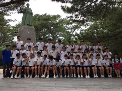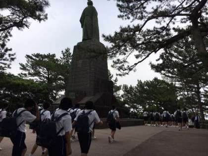 体験活動を終えた、私たちは、坂本龍馬の像が立つ、桂浜に到着しました。龍馬像の前で、クラス写真の撮影をしました。1組からです。