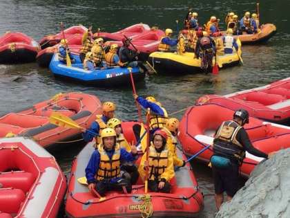 最高の天気の下、吉野川ラフティングが始まりました。インストラクターさんの詳しい指導を受けて、川にボートを出して行きます。