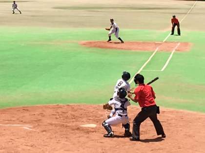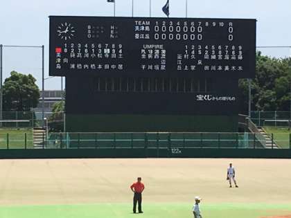 会場は、南港中央公園野球場です。スタンドや電光スコアボードのある本格的な野球場です。最高の舞台で試合は繰り広げられました。試合は、両者とも、最終回7回まで譲らず、0−0のまま延長戦に入りました。