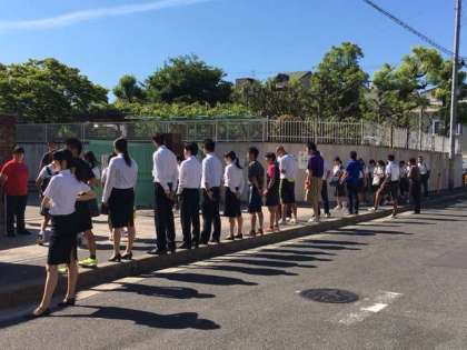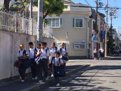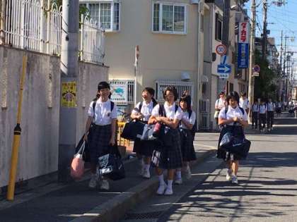 1年生は、明日から和歌山県日高町へ一泊移住にでかけます。今日はその荷物の確認がありますので、スポーツバッグを持っての登校です。毎朝、たくさんの先生方や教育実習生の皆さんが子どもたちの登校を出迎えてくれます。