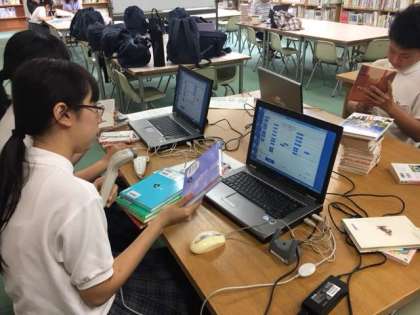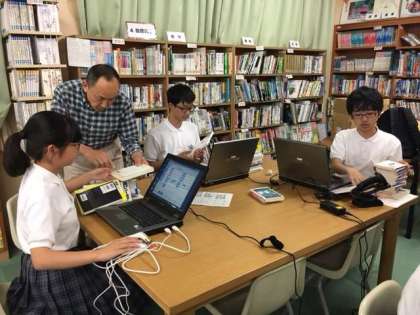 現在、図書室では、読書通帳機システム稼働の準備に向けて、蔵書1万冊余りを、データベース化する作業を行っています。この作業には、住吉区の図書コーディネーターの先生や本校のコーディネーターさん、図書ボランティアさんが少しずつ取り組んでいただいていますが、テストや行事も終わりましたので、今日からは強力な助っ人として、パソコン部が加わってくれました。早速、棚の本を取り出して読み取り作業を始めました。