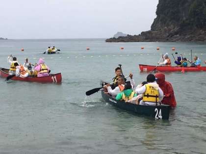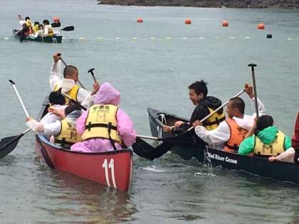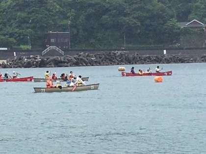 少し肌寒い気候ですが、体験活動が始まりました。カヌーは、6人乗りです。