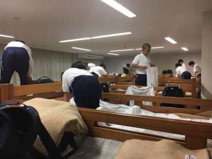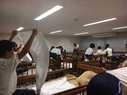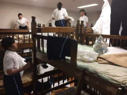 1年生一泊移住少年自然の家、夕食が終わりベッドメイキングです。