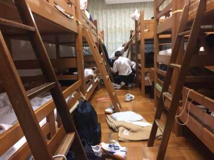 1年生一泊移住少年自然の家、夕食が終わりベッドメイキングです。
