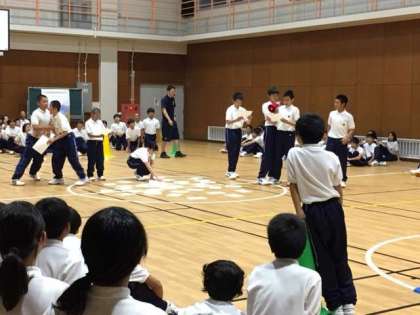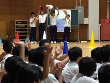 1年生の一泊移住では、恒例の夜のレクリエーション?室内オリンピックが始まりました。ジャンケン大会やクイズ形式の対抗戦などいろいろなゲームがあります。