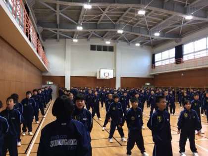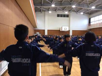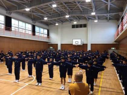 午前6時30分、体育館で、朝の声出しと体操が始まりました。