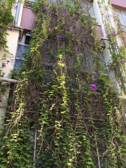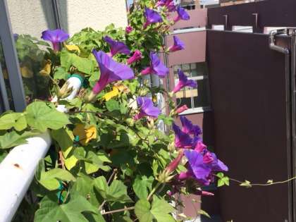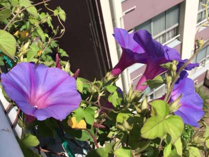 正門左手の校舎に沿って、「琉球アサガオ」が植えられています。これは、日差しを避ける「緑のカーテン」として、1階から4階までの高さに植えられているものです。そのアサガオの花が、一般のアサガオより一足早く咲き始めました。鮮やかな紫色が特徴です。
