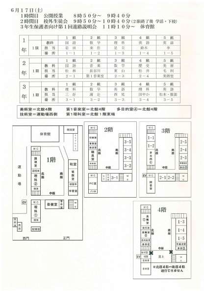 今月は、明後日17日が土曜授業日です。1時間目は、公開授業参観です。各クラスの実施授業は、次の通りです。来校、参観をお待ちしております。また、2時間目は「校外生徒会」で、夏の校外ソフトボール大会などについて、PTA委員さんが入って話し合いを行います。