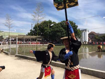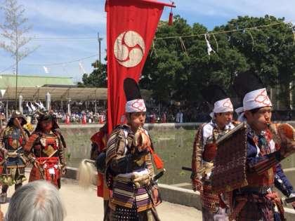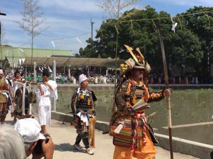 今日14日、校区住吉大社では、1800年余りの歴史を有すると伝わる、国の重要無形民俗文化財にも指定されています「御田植神事」が執り行われました。これは、住吉大社の御田に田植えを行う年中行事です。晴天の下、大勢の見学者で賑わい、やっこさんの誘導で式が始まりました。早速、武者姿で本校生が登場しました。