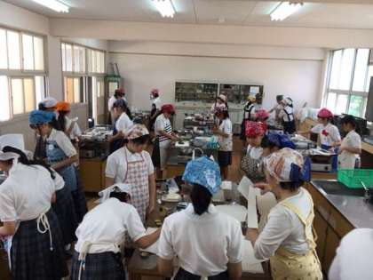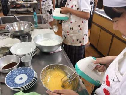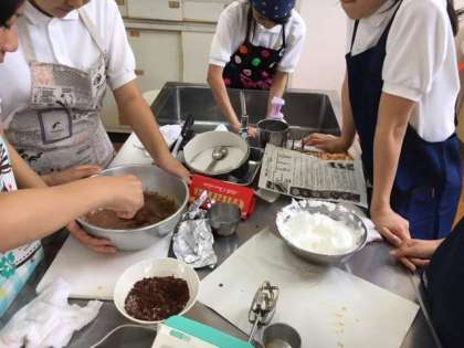 土曜日放課後、ハンドメイド部では、調理実習を行いました。作るものは、ガトーショコラです。チョコレートや卵などを使って洋菓子作りに挑戦です。手際よく、部員みんなが作業を進めています。