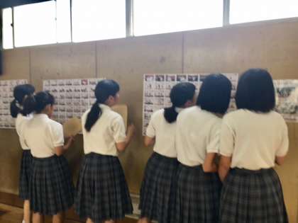 現在、体育館では、修学旅行の業者さんが撮影した、スナップ写真、集合写真の販売注文を受け付けています。どれも思い出のいっぱい詰まった写真で、1枚1枚にその時々の場面がよみがえってきます。子どもたちも楽しそうに眺めています。