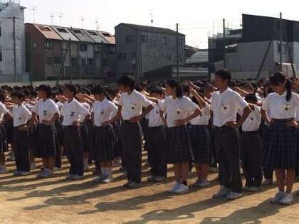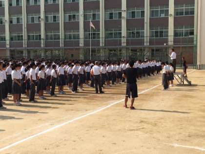 7月最初の全校集会です。一気に暑さがやって来ましたが、元気に運動場で集会です。今日は、昨日、大阪3位になった陸上長距離、小林選手の表彰伝達を行いました。
