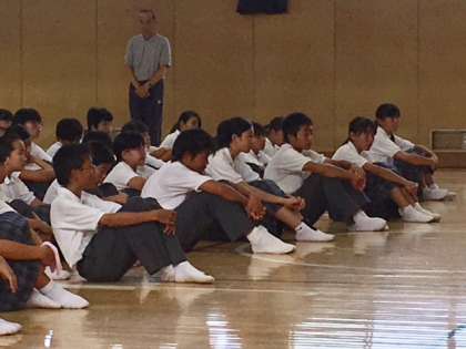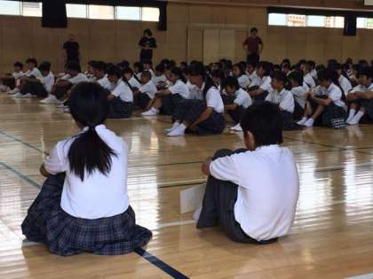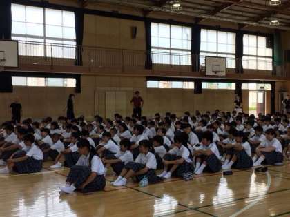 金曜日、1年生学年集会です。明日は土曜授業で、平和学習で映画鑑賞をします。会場は住吉区民ホールをお借りしています。