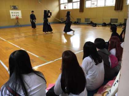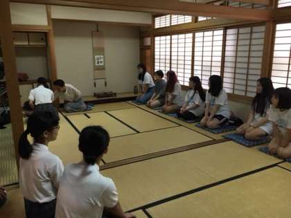 歓迎式の後は、4班に分かれて、クラブ見学と体験です。案内してくれるのは、生徒会役員の皆さんとチャレンジ部の皆さんです。実際に体験しますのは、茶道部でお茶をいただくこと、ハンドメイド部で実習の試食をします。また剣道部では、練習稽古を見学します。