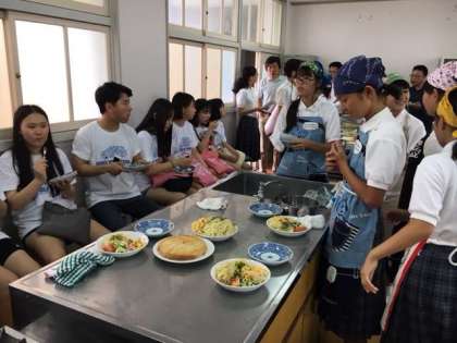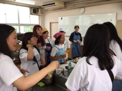 ハンドメイド部の今日の実習は、バナナケーキと冷やし中華です。湖西中学の皆さんも早速、試食しました。この試食がとても好評で、特に冷やし中華は気に入ったようです。交流では作り方を教わったり、記念写真を撮ったりと大いに盛り上がっていました。