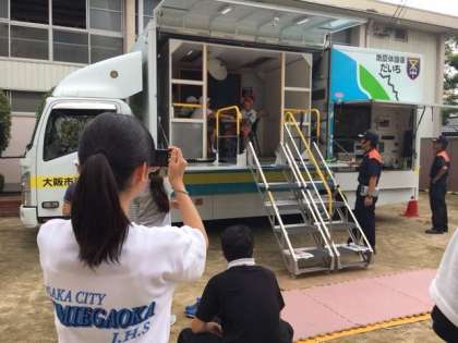 活動内容では、大学生のボランティアグループとのゲーム活動や、住吉消防署からは、地震体験車がやって来て、震度7を実際に体験したりなど、有意義な活動で過ごします。本校文芸部写真班も、いっしょに活動を楽しませてもらいながら取材協力しました。