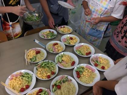 チャレンジ部では、現在、夏休み勉強会に取り組んでいますが、今日のお昼ご飯は、手作りの冷麺です。キュウリや玉子を焼いて、手作りです。とても美味しくできました。