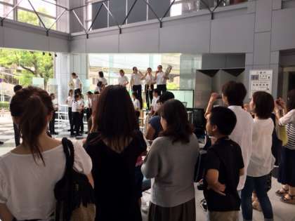 吹奏楽部は、今日、大阪府吹奏楽コンクール本選出場を目指して、地区大会に臨みました。多数の学校が参加する地区予選です。本番前から、子どもたちの緊張した姿が見られます。そして、本番を無事を終えて、記念写真となりました。たくさんの保護者の方もみえています。