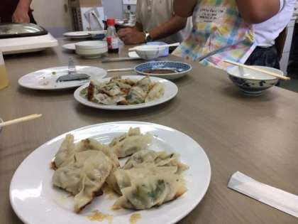 漂っています。焼き上がりもうまく行き、早速、試食です。「美味しい!!」という声が挙がりました。全部で180個余りの餃子を焼くことができました。チャレンジ、成功です。