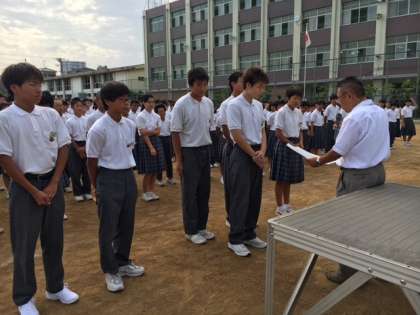 二学期最初の全校集会が行われました。今日は水泳部の表彰伝達を行いました。水泳部は、先般の大会で、大阪市、男子総合優勝、女子準優勝を飾っています。