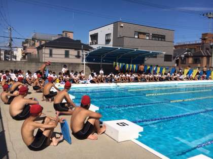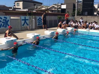 晴れ渡った、夏らしい絶好のコンディションの下、2年生では、「学年クラス対抗水泳大会」が行われています。運動場で準備体操のあと、プールで大会が始まりました。