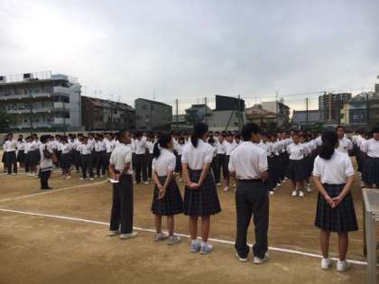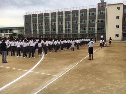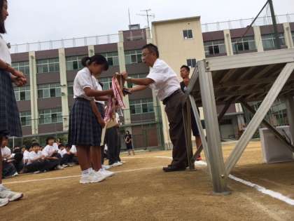 9月最初の月曜日で、全校集会が行われました。表彰では、大阪市総合優勝の水泳部、ブロック団体戦優勝の女子剣道部などの表彰を行いました。