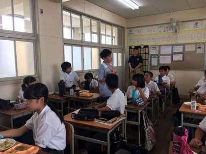 給食の時間に顔を初めて合わせていますので、その給食に続いて、自己紹介が始まりました。台湾の子どもたちは、英語で自己紹介をしてくれます。