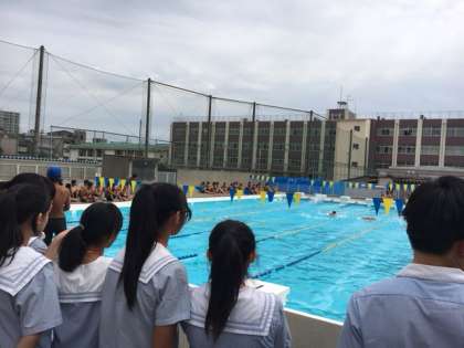 そして、5時間目は授業見学です。最初は台湾にはない、水泳の授業です。みんな興味深く授業を見ています。