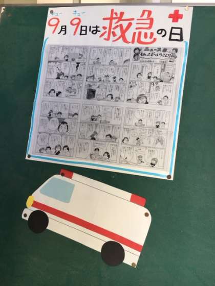 今日9月9日は「救急の日」です。改めて、健康について考えてみましょう。保健室前には、イラスト漫画で解説が行われています。