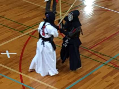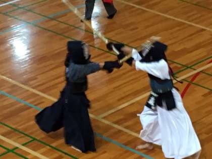 女子の初戦の相手は、白剣道着の住之江区真住中学校です。この試合、相手チームは3人しか部員がおらず、すでの二人勝ちした状態で、本校が一人すぐに勝ちましたので、2回戦進出を決めました。