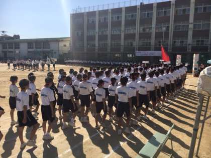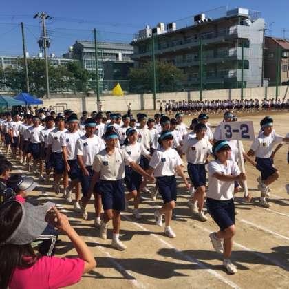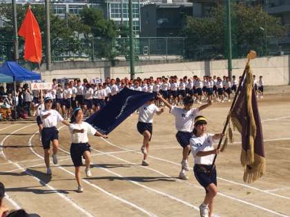 午前9時、雲一つない青空の下、第40回目を迎えた、体育大会の幕が開きました。生徒会を先頭に、元気よく全員が、吹奏楽部の演奏の中で入場します。