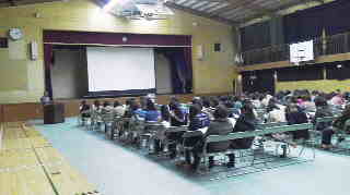 今日は、体育館で3年生の保護者の方々を対象にした修学旅行説明会を