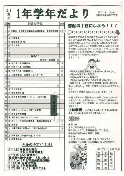 1年生の学年だより10月号です。 1年学年だより(PDF版)⇒ 10月号